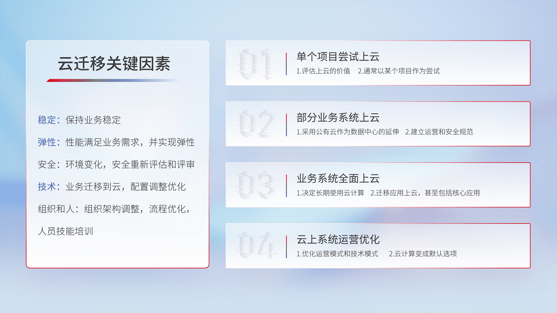 结合实际业务,,,,从规划设计、、、云平台选型、、云原生改造、、、数据迁移、、、、集成交付,,,迁移全过程为客户识别最佳上云路径,,做好风险识别管理,,设计网络架构、、、、身份权限、、、安全审计合规、、操作审计、、日志审计、、、、监控告警策略、、多站点容灾设计等,,,,对云上基础设施进行整体规划,,提升IT治理水平,,,以满足弹性、、、、高可用、、高性能的需求。。